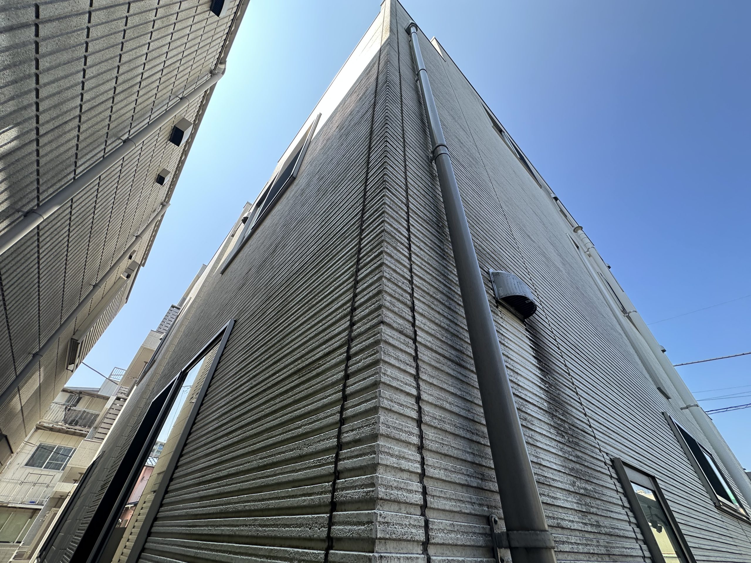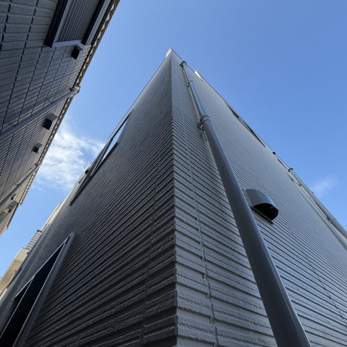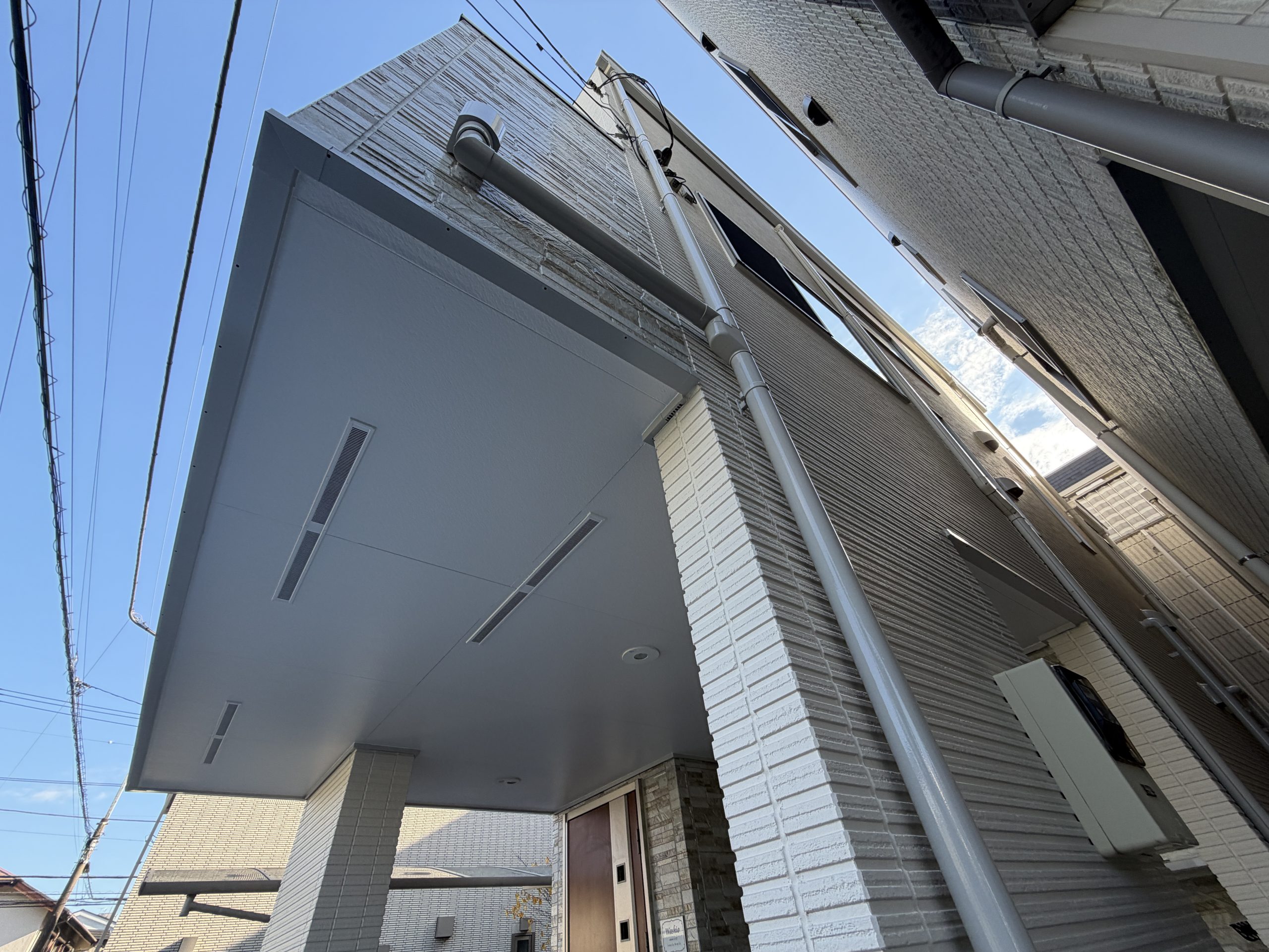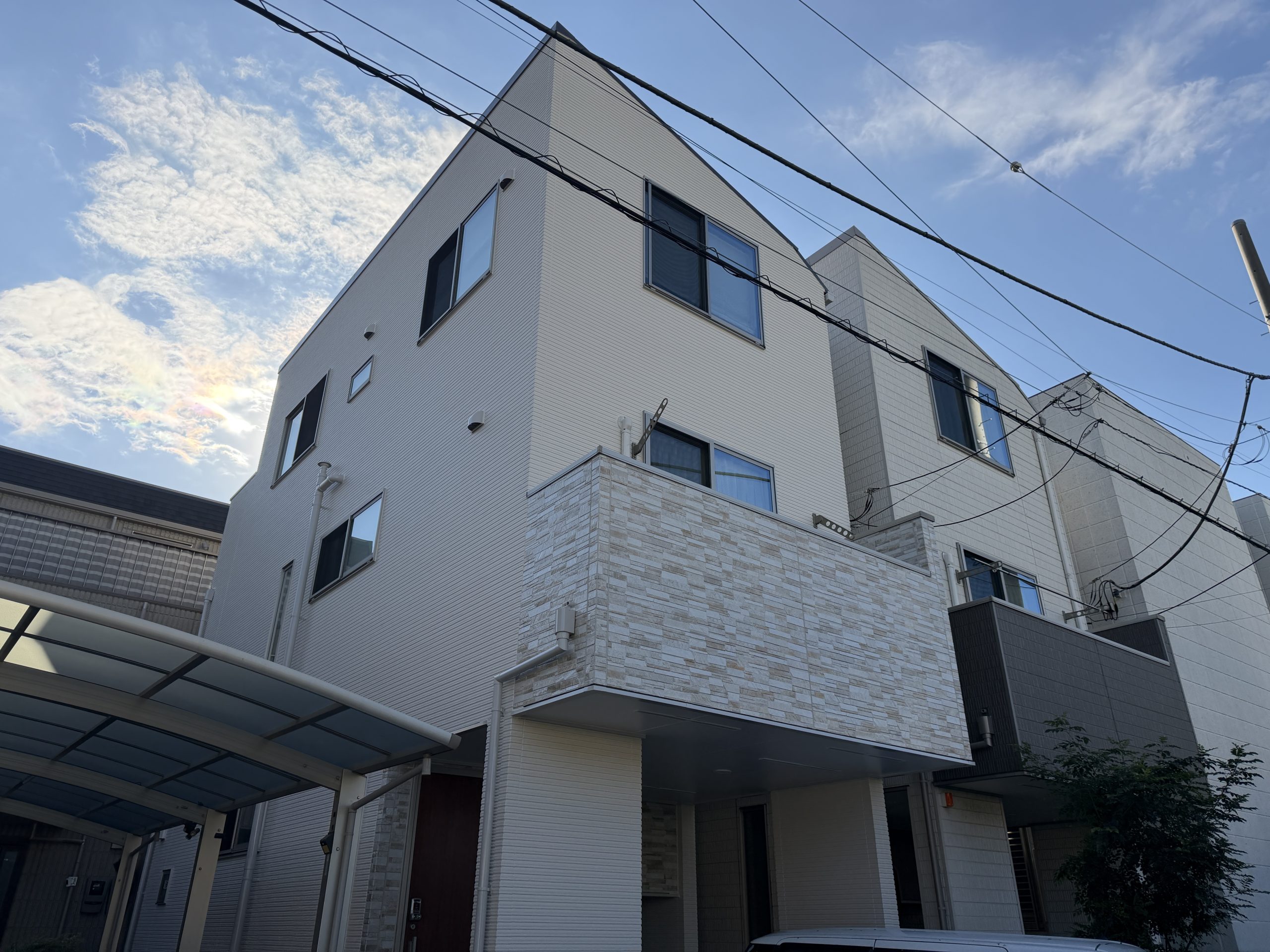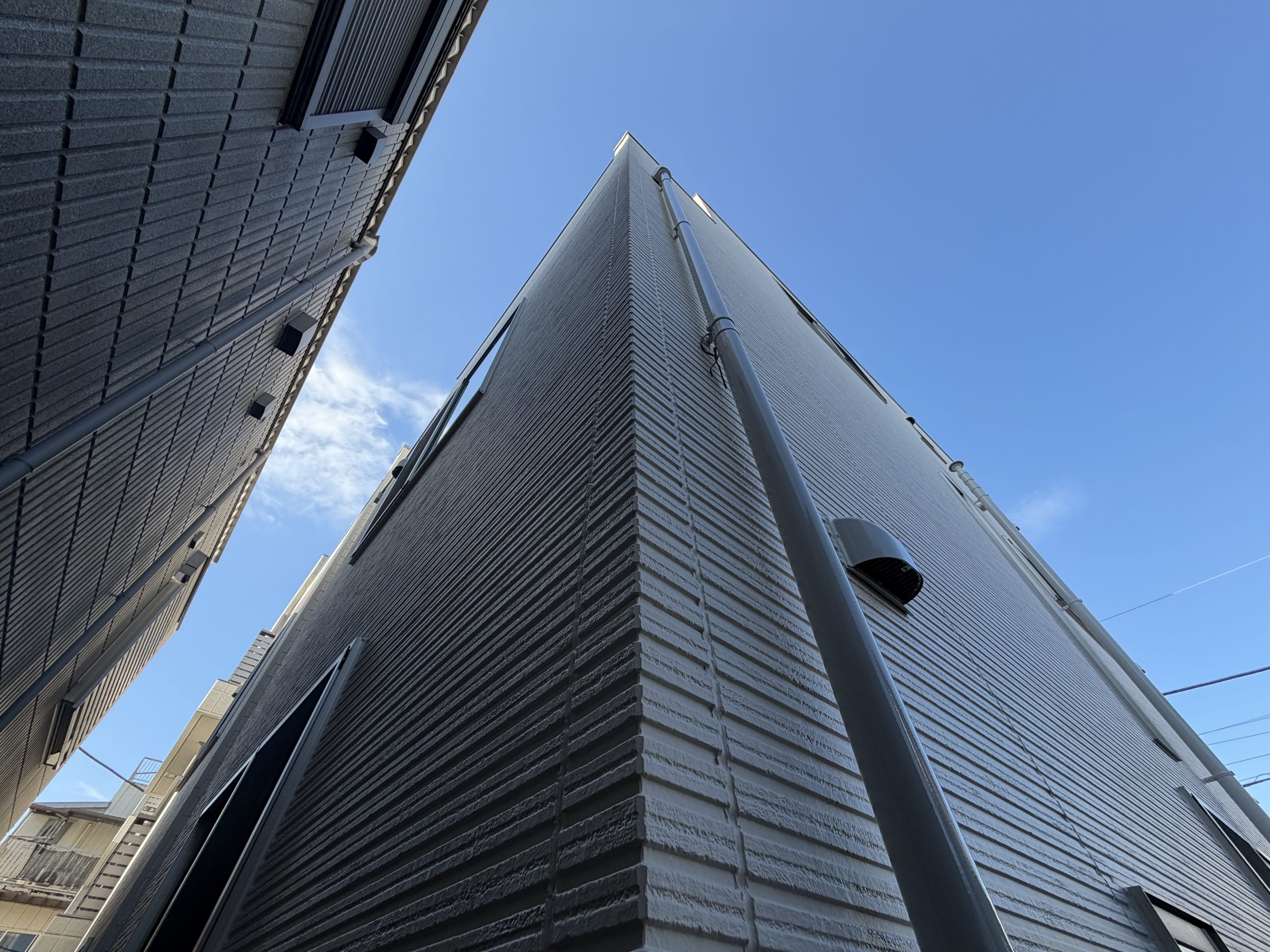 3階建の戸建て住宅の外壁、屋根塗装でした。 外壁は道路面にタイル調のサイディングが張ってあり、施主様のご意向でタイル調の部分だけ意匠性の変えずにサイディングの保護機能を付加するクリア塗料を使用しました。 塗料は単色部分が水谷ペイントの最高級塗料であるナノコンポジットMUKI、クリア部分は日本ペイントのピュアライドUVプロテクトDFクリヤーを使用しました。 施主様は夏場の3階の暑さにお悩みでしたので屋根の塗料はアステックペイントの遮熱塗料であるスーパーシャネツサーモFを使用しました。 また換気扇周辺のカビと苔にお悩みでしたがナノコンポジットMUKIは汚れが非常につきにくい超低汚染性と艶の少ない高い意匠性と防藻性能を高いレベルで両立した塗料となっていますので、今後長期間に渡って綺麗な状態を維持できると思います。 |